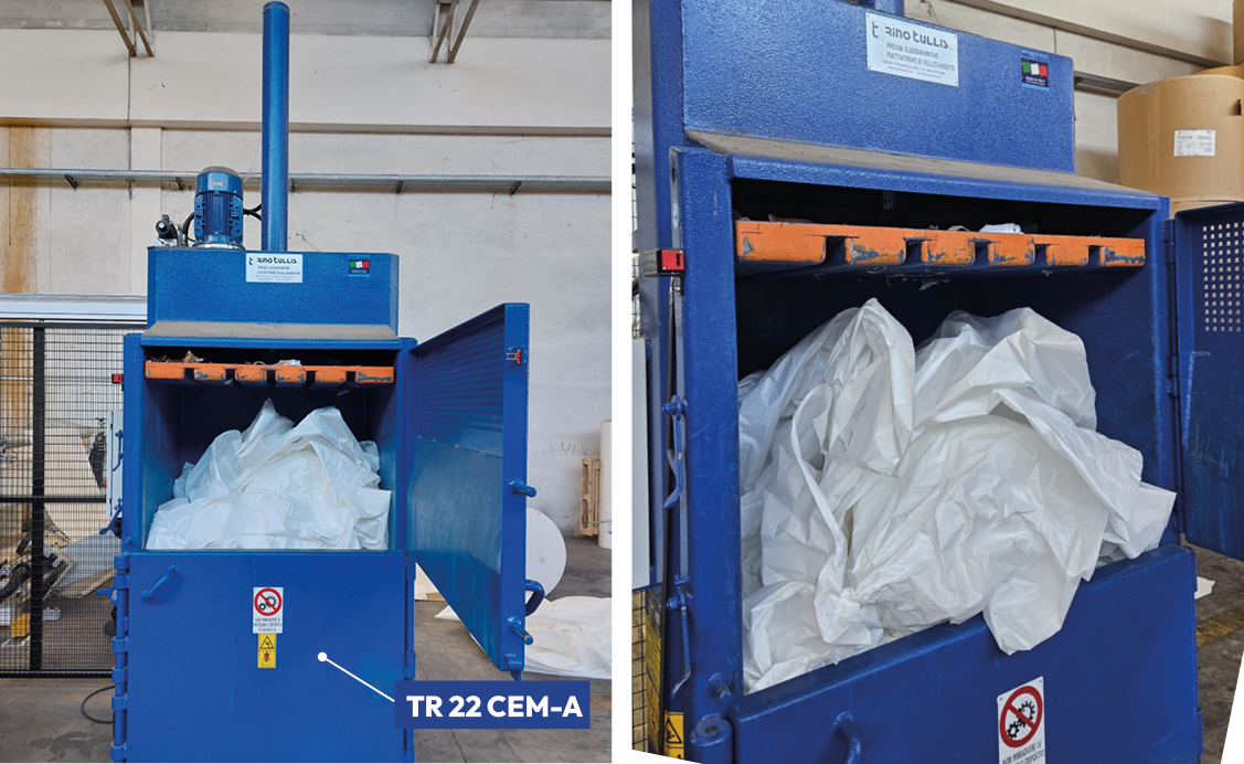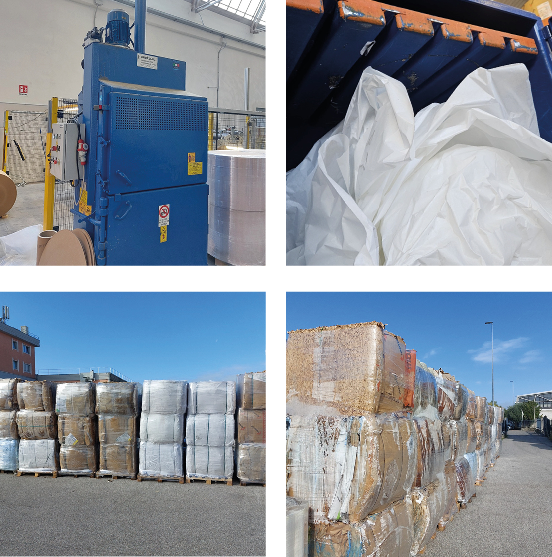 Come utilizzate le presse? Le utilizziamo per gestire responsabilmente gli scarti di carta, separando quella bianca da quella avana. Le balle compattate con la pressa poi le vendiamo alle cartiere, in un’ottica di economia circolare.