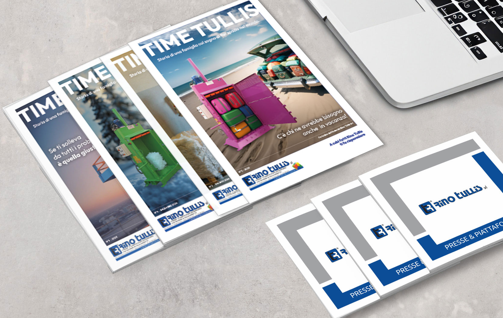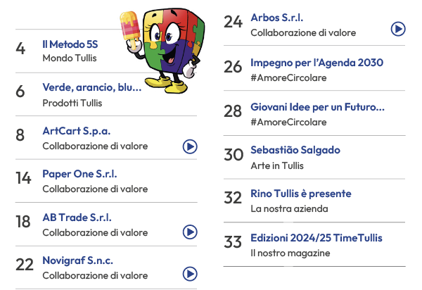 La nostra Azienda si impegna a produrre materiali informativi chiari, accessibili e sempre aggiornati. In questa pagina è possibile sfogliare il Catalogo di Rino Tullis Srl e gli ultimi numeri del magazine TimeTullis, che raccontano collaborazioni di valore e promuovono la sostenibilità e buone pratiche nel mondo imprenditoriale.