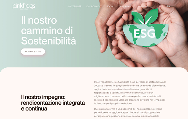 La trasparenza è al centro dei valori aziendali, per questo motivo Pink Frogs Cosmetics ha creato un minisito dedicato alla rendicontazione continua, con il quale offre ai propri stakeholder uno strumento semplice e accessibile per seguire da vicino il lavoro e i progressi in ambito ESG.