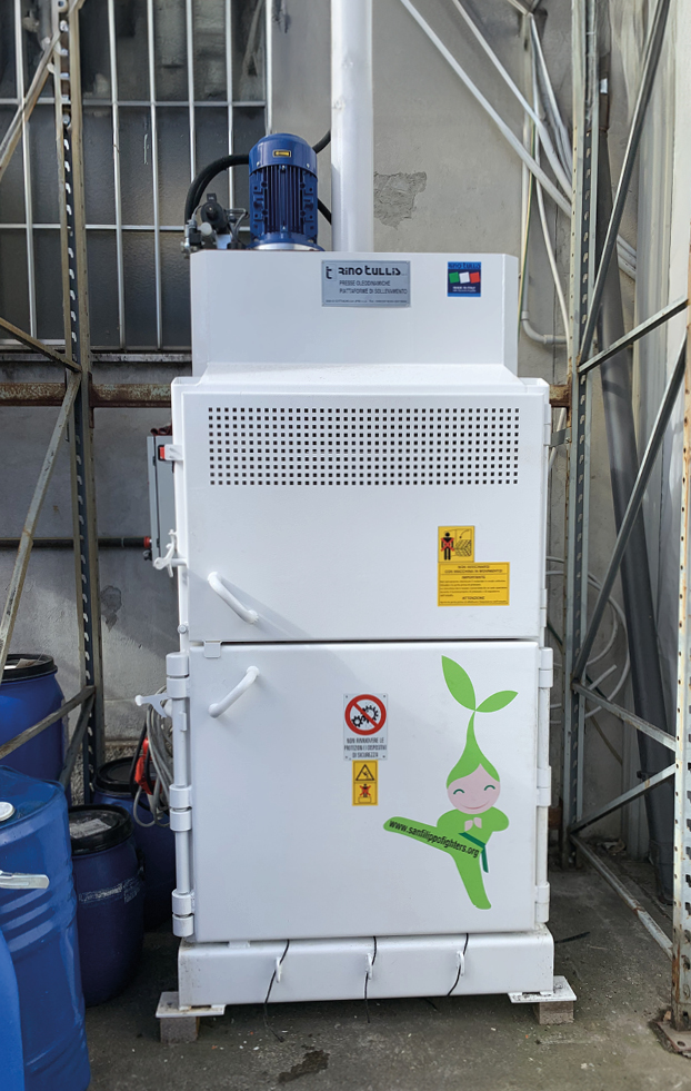 Per compattare la pellicola da riciclare è stata acquistata una pressa verticale Tullis TR 12 CEM-A che viene utilizzata per ridurre il volume sia della plastica, sia dei fusti di ferro.