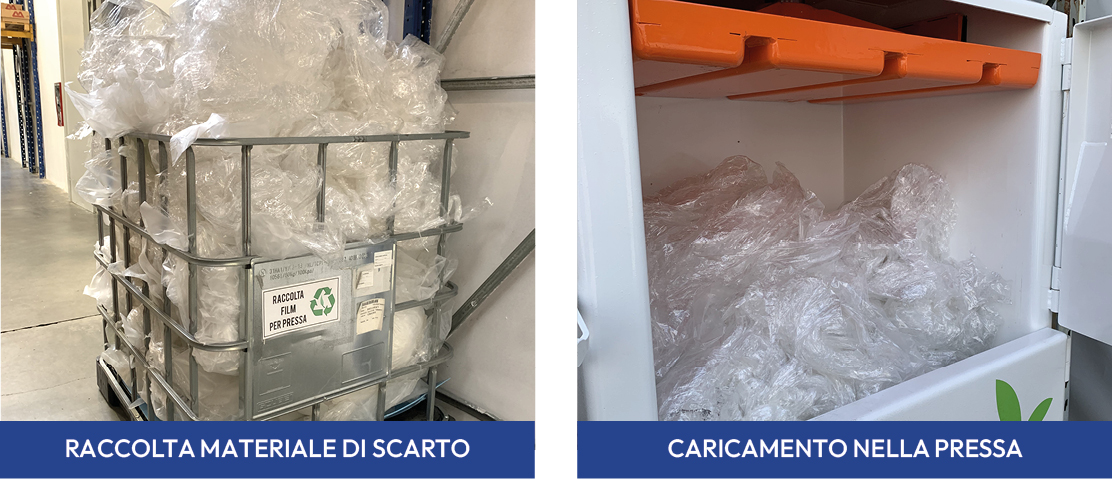 La pellicola trasparente che avvolge tutti i pallet di materiali che entrano in azienda da fornitori e clienti viene raccolta, viene pressata e successivamente inviata all’impresa che effettua il processo di riciclo.